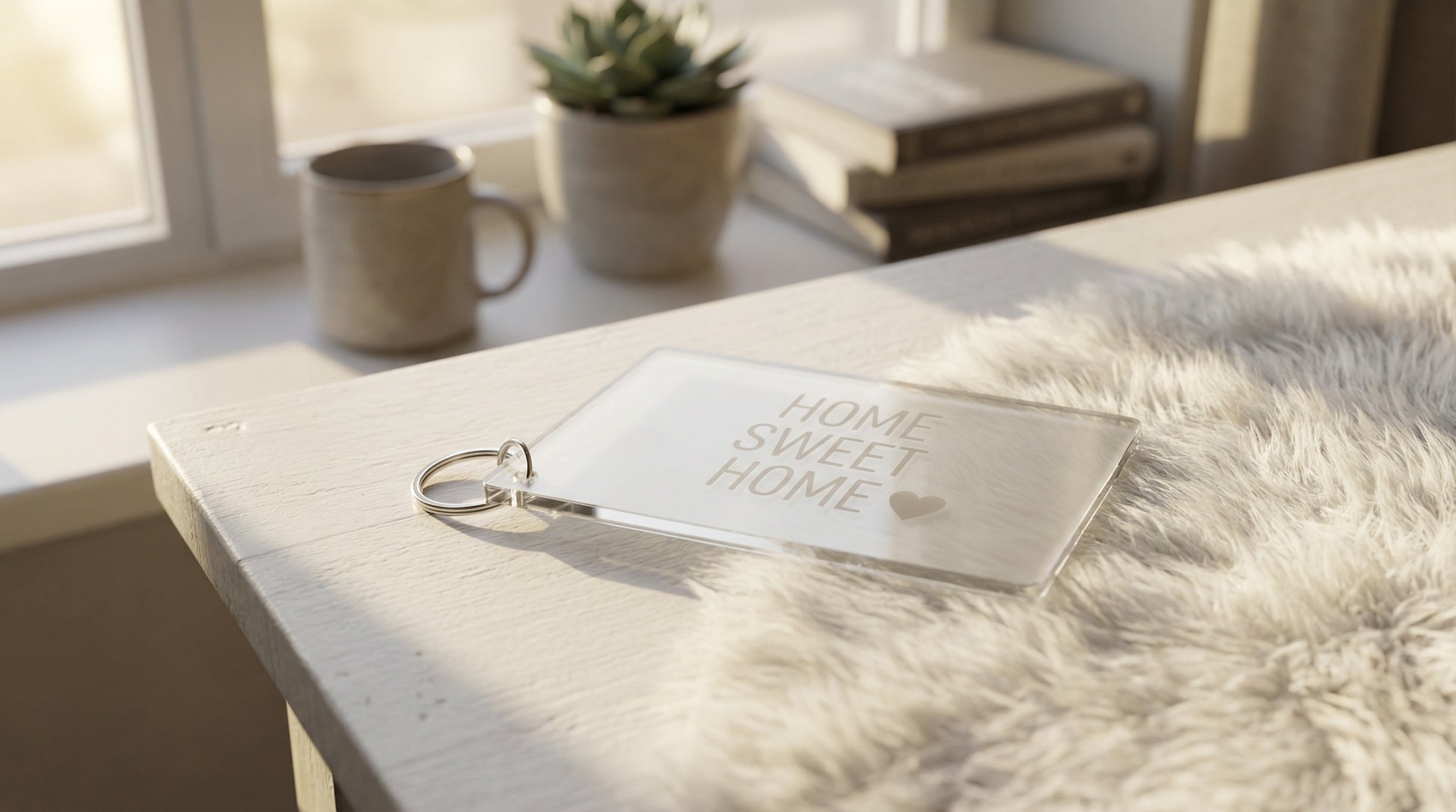 Portachiavi personalizzato inciso su plexiglass trasparente con finitura satinata elegante.